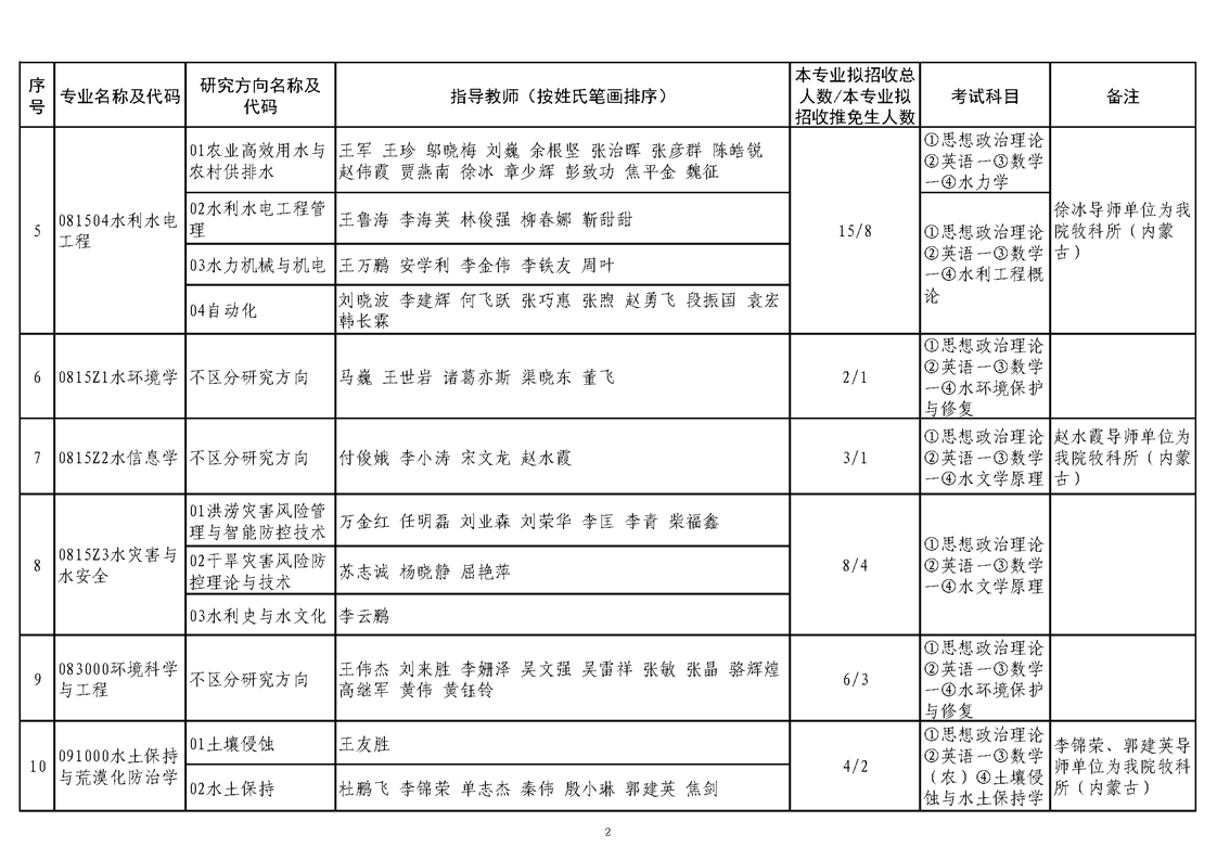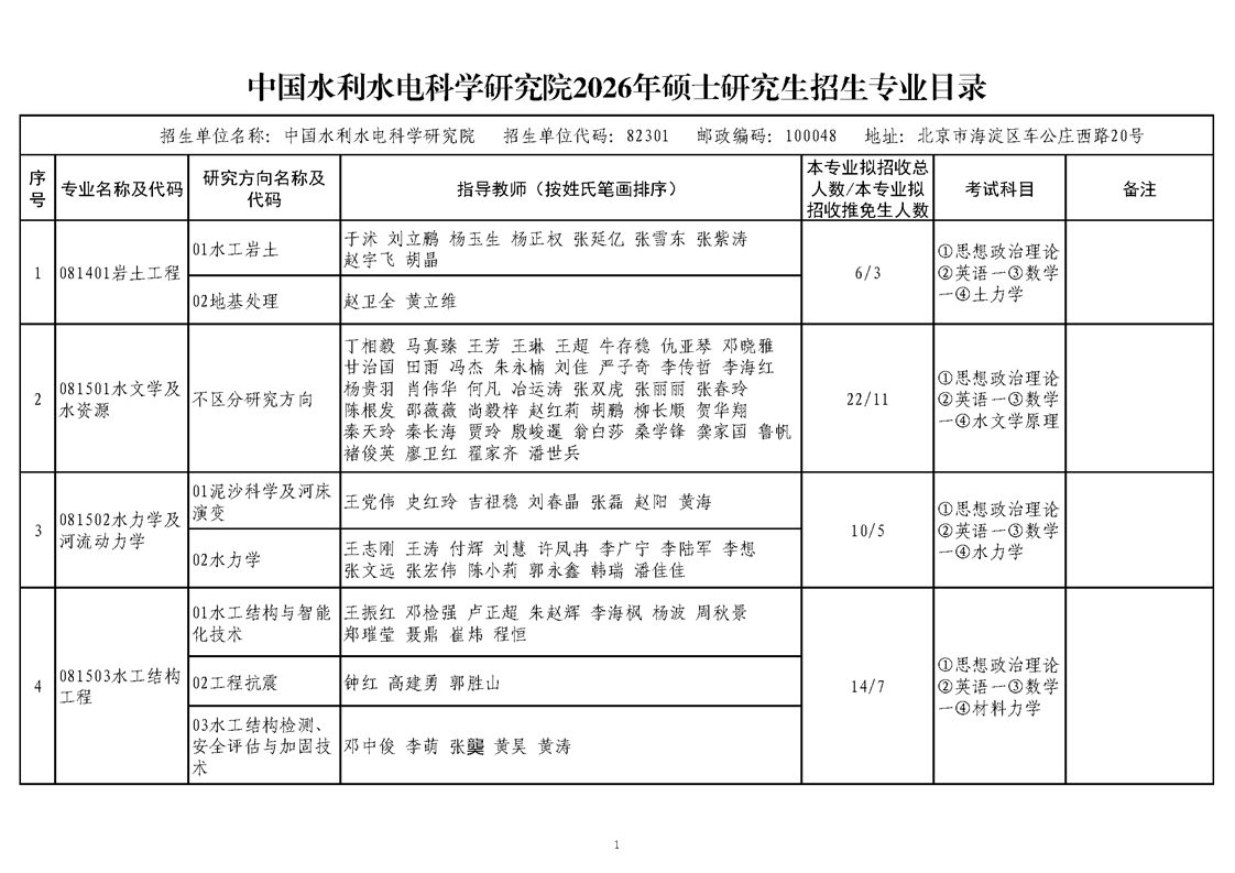 中国水利水电科学研究院2026年硕士研究生招生专业目录