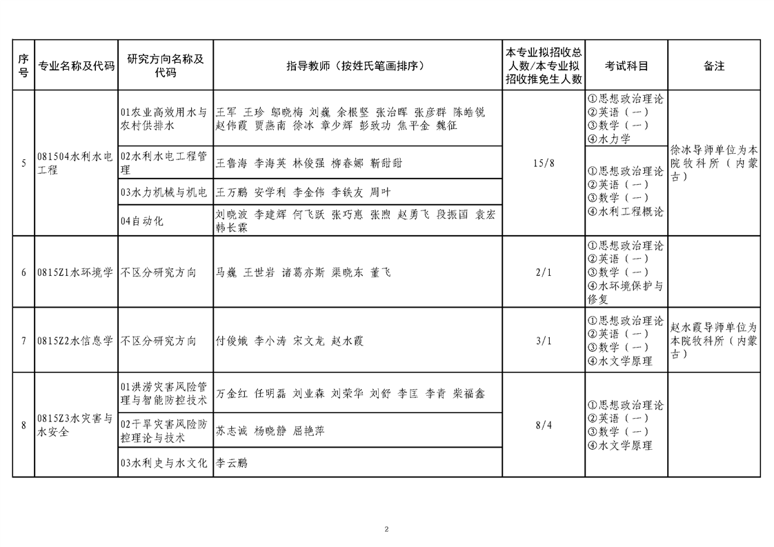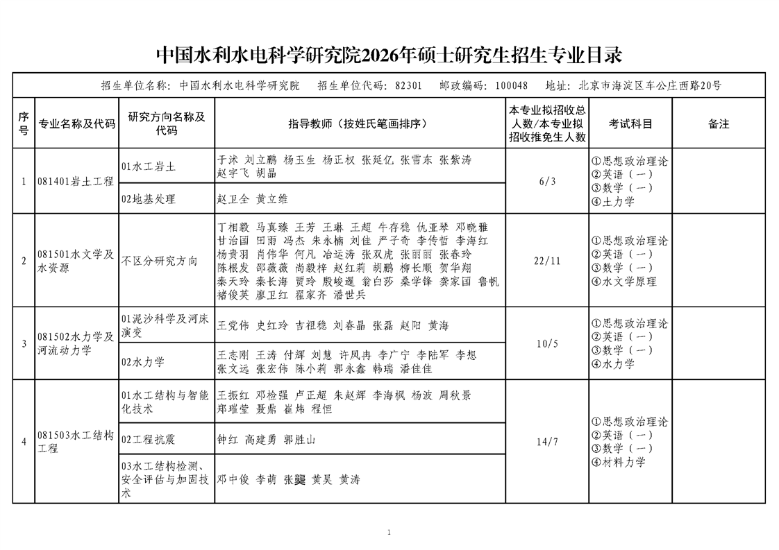 中国水利水电科学研究院2026年硕士研究生招生专业目录